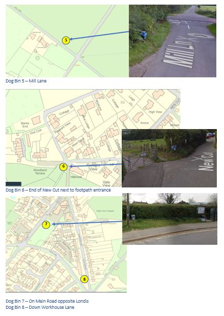 The position and use of dog bins is under regular review. The Parish Council pays for and manages all the below dog bins within the Parish to ensure the contract and bins are properly managed.