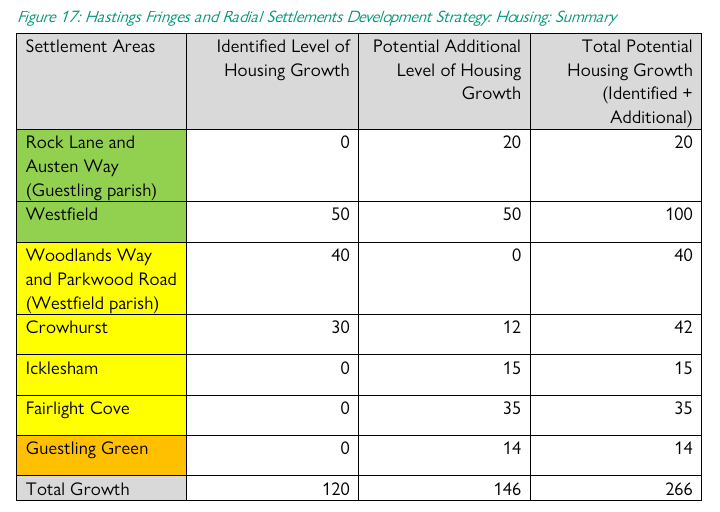 At the moment an additional 50 houses within the village has been identified with the ‘potential sites’ shown in the Northern Parishes – Site Assessments. This will be in addition to the 50 allocated in the 2014 Plan which haven’t been built out (40 former Moorhurst site and 10 land South West Gould’s Drive) plus the currently unbuilt Michael Tyler site in the Hasting Fringes (40 houses) but is still part of Westfield Parish. These figures are laid out in the table below which is on page 135 of the draft Local Plan 2020-2040. The two lines relevant to Westfield Parish are ‘Westfield’ and ‘Woodlands Way and Parkwood Road (Westfield Parish).’