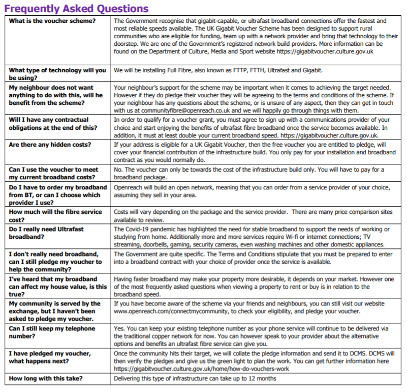 Please see below for some FAQs from the Openreach Parish Guidance document: