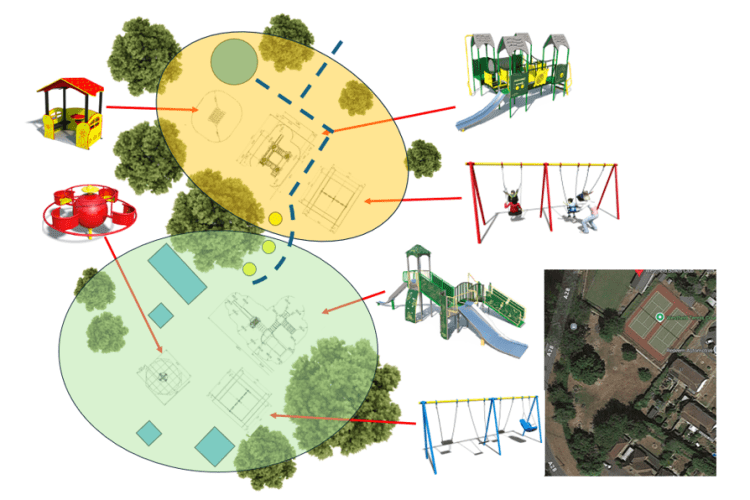 The above is the proposed layout for the new playground equipment. All new equipment looked to be inclusive as possible. It will require the removal of some of the older redundant playground equipment and the old swings. It also offers the opportunity to move equipment from areas that get water logged and install new grass matting which will help with future issues of water logging. The new playground area will feature the following: